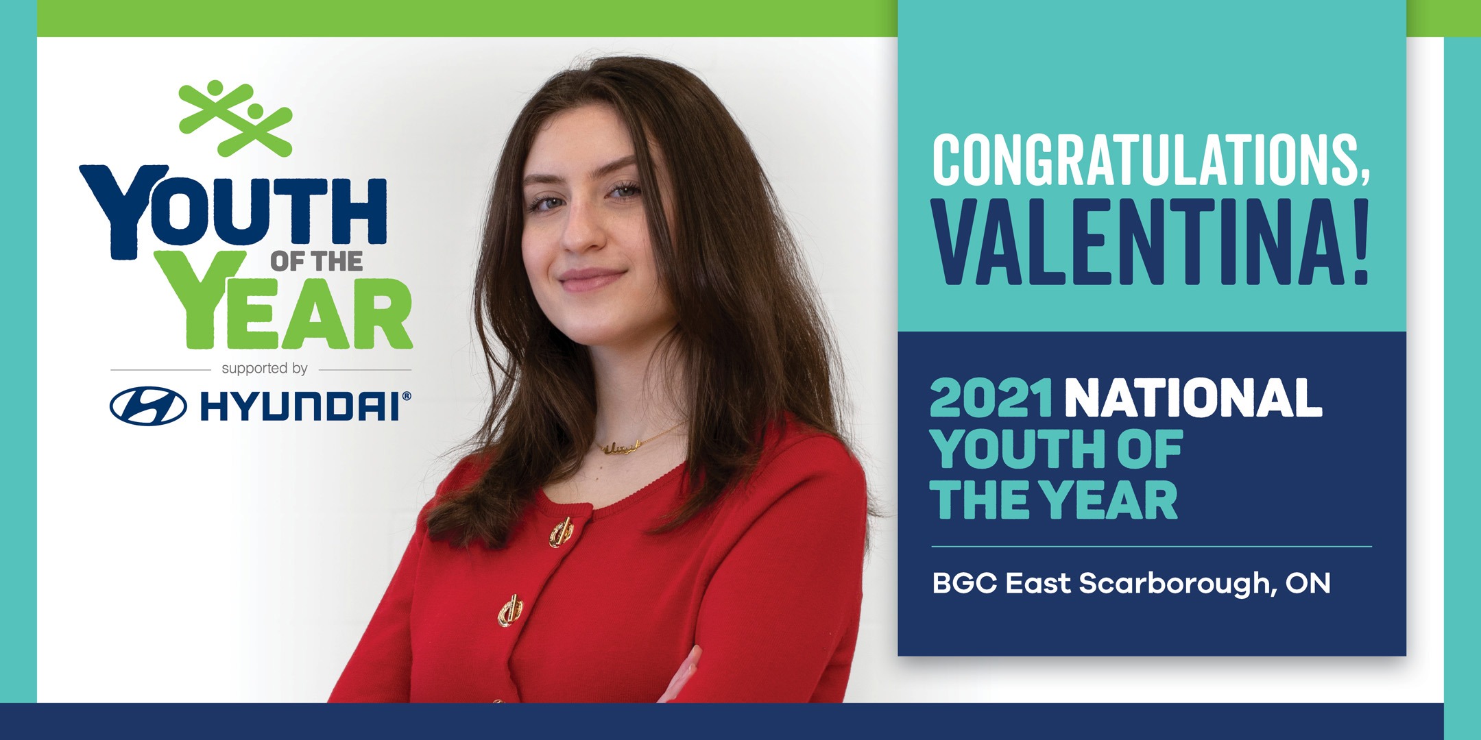 “Learning about BGC Canada’s regional and national winners has been truly inspiring. These young leaders demonstrate strong leadership, clear vision, and an unbelievable work ethic. Hyundai Canada is proud to support Youth of the Year, helping the winners become emissaries of change in their communities,” says Kirk Merrett, Director of Human Resources & Administration, Hyundai Canada. “The work exhibited by the participants is a testament to the impact BGC Canada has in supporting youth for a brighter future. Congratulations to Valentina and thank you to BGC Canada for their unwavering resilience and dedication to our youth and their communities, despite the challenging circumstances imposed by the pandemic this past year.”